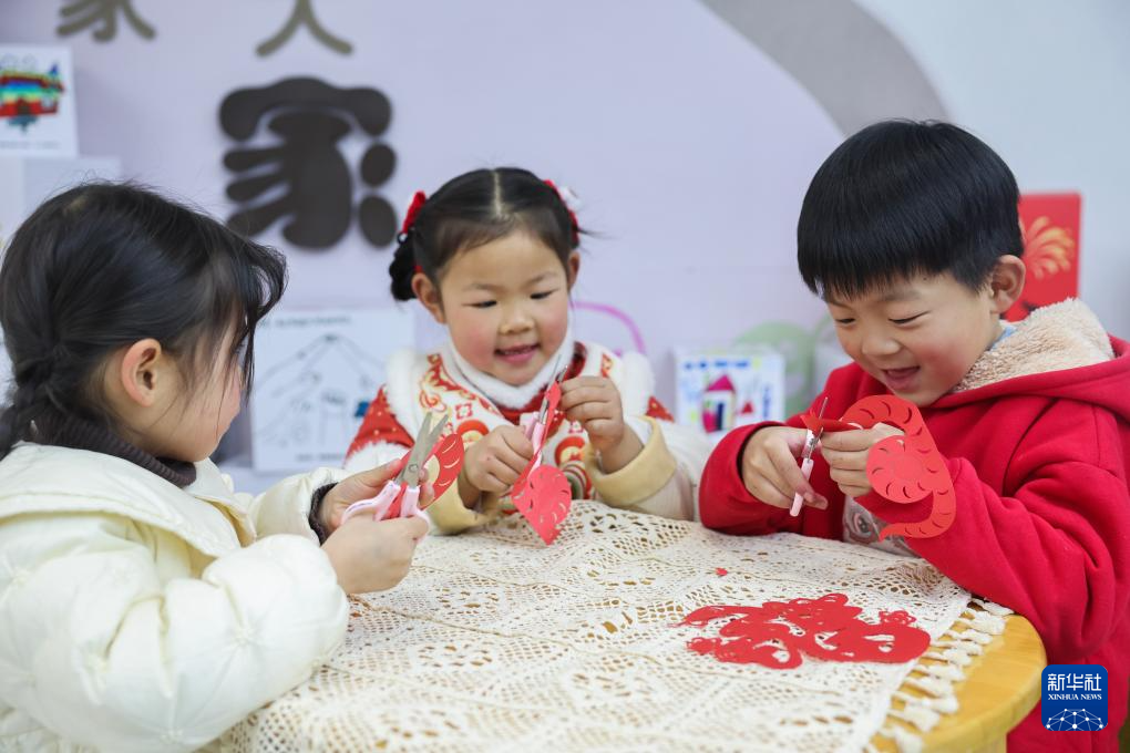 2月20日,孩子们在老师的指导下制作蛇年主题剪纸。