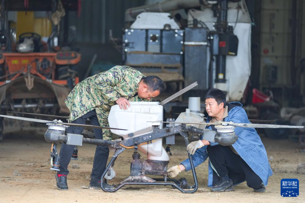 2月20日,在湖南省浏阳市龙伏镇的鼎钧种养专业合作联合社,工作人员在检修植保无人机。