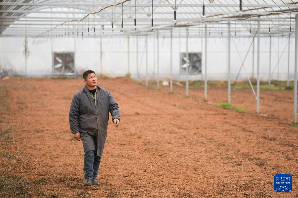 2月20日,在湖南省浏阳市龙伏镇的瑞康农机专业合作社,工作人员在智慧育秧大棚检查水肥一体化装置的喷灌头。