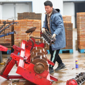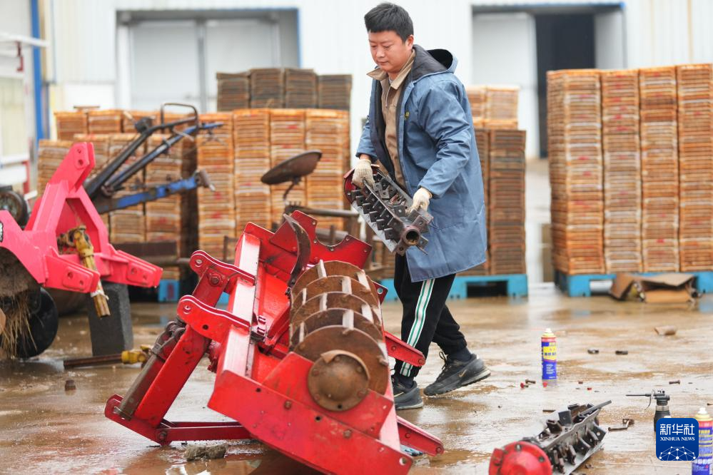 2月20日,在湖南省浏阳市龙伏镇的鼎钧种养专业合作联合社,工作人员在更换旋耕机配件。