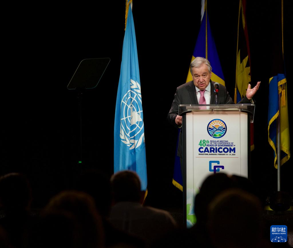 2月19日,在巴巴多斯首都布里奇敦,联合国秘书长古特雷斯在加勒比共同体(加共体)第48届政府首脑会议开幕式上发言。