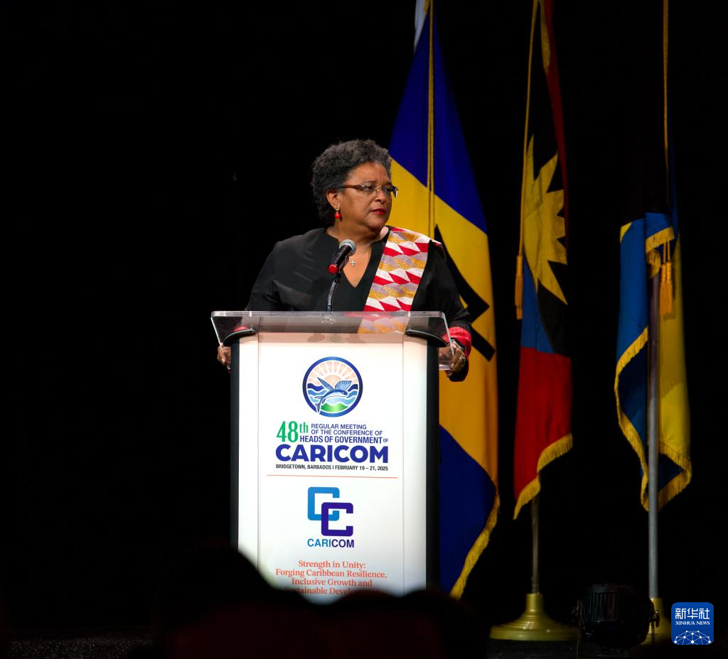 2月19日,在巴巴多斯首都布里奇敦,加勒比共同体(加共体)轮值主席、东道国巴巴多斯总理莫特利在加共体第48届政府首脑会议开幕式上发言。