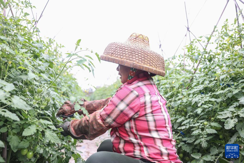 2月19日,在海南定安县潭黎村,村民在管护田地里的圣女果。
