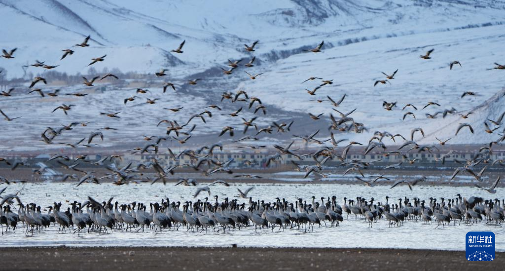 西藏自治区拉萨市林周县平均海拔约4200米,是黑颈鹤的主要越冬地之一。一场冬雪,将林周县虎头山水库染成一片银白,黑颈鹤仿佛是这洁白舞台优雅的舞者。