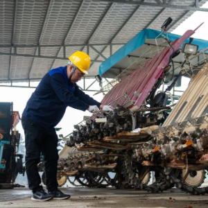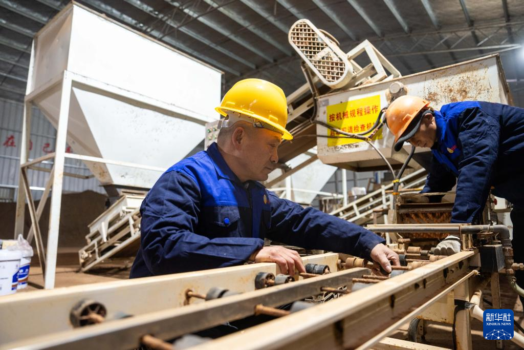 2月21日,在长沙市望城区桥驿镇一处育秧工厂,农机技术人员在检修自动化育秧设备。