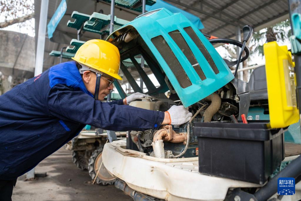 2月21日,在长沙市望城区桥驿镇一家农机专业合作社,农机技术人员在检修插秧机。