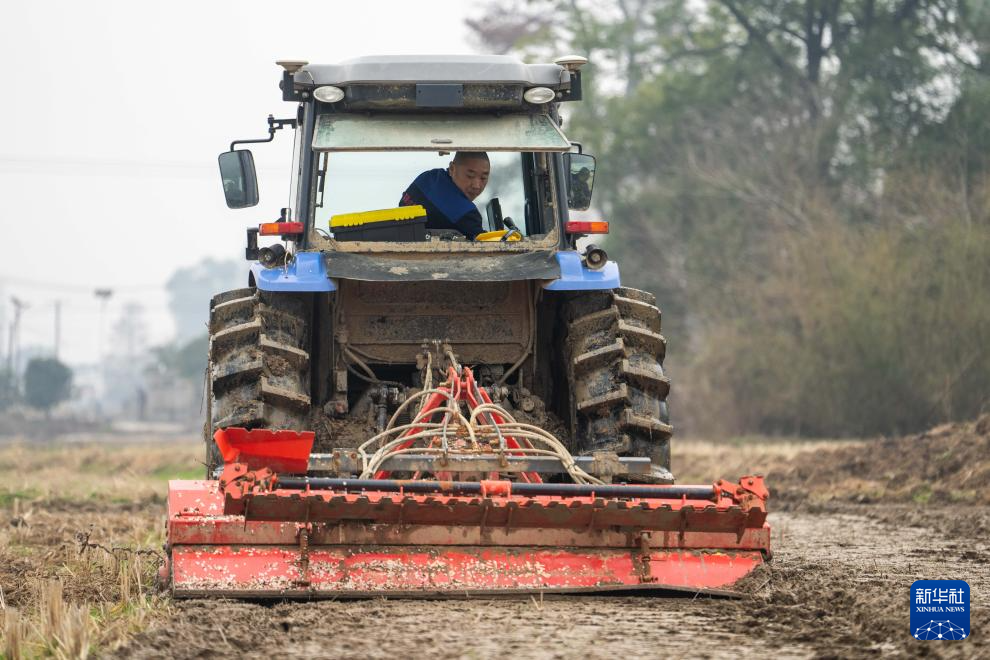 2月21日,在长沙市望城区桥驿镇群力村,农机技术人员在检测调试旋耕设备。