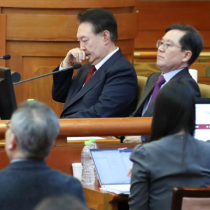 2月20日,尹锡悦(左)在韩国首尔宪法法院出席总统弹劾案庭审。