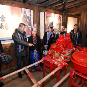 2月20日,意大利客人在霞浦县溪南镇半月里村参观畲族婚俗馆。