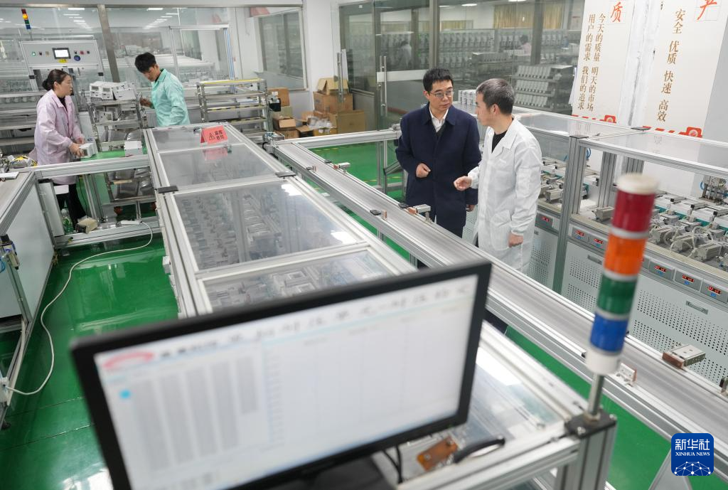 在浙江省温州市一家专精特新企业,生产负责人向胡东方(右)介绍企业自主创新情况(2025年2月18日摄)。