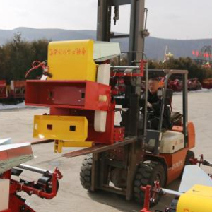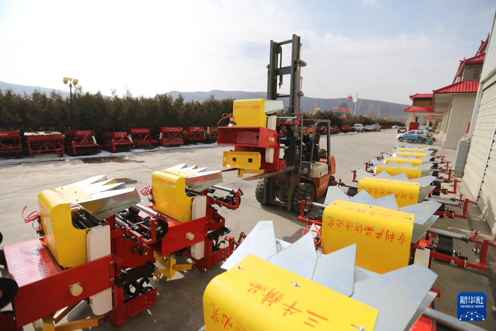 2月21日,甘肃省定西市一家农机制造企业工人驾驶叉车转运准备外销的农机。