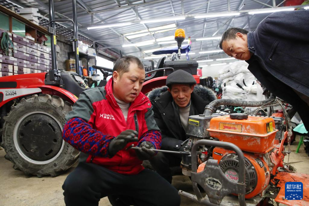 2月20日,重庆市黔江区普顺农机专业合作社技术员(左)为村民维修微耕机。