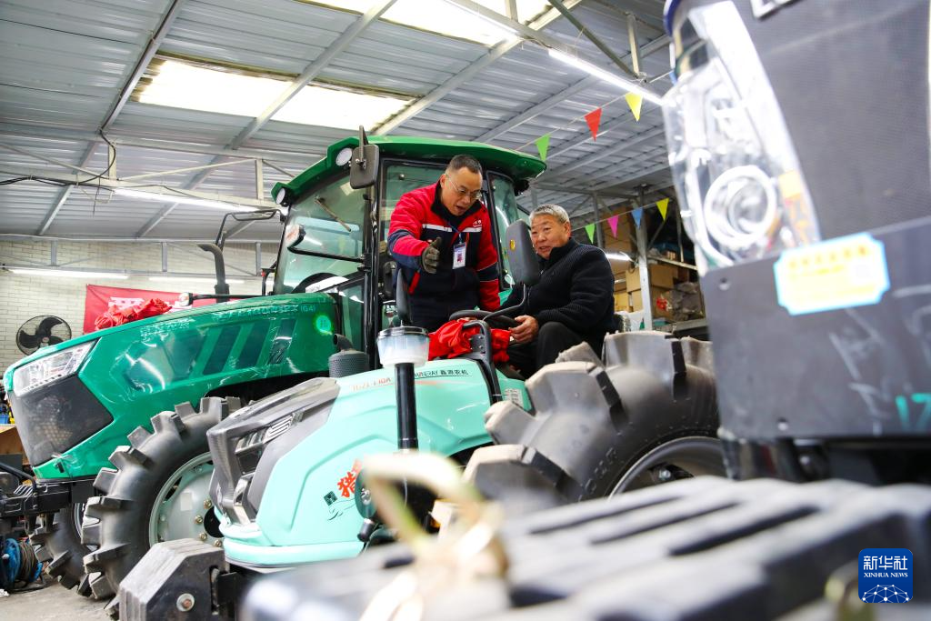 2月21日,在甘肃省张掖市甘州区农机大市场,销售人员向农户讲解拖拉机操作方法。
