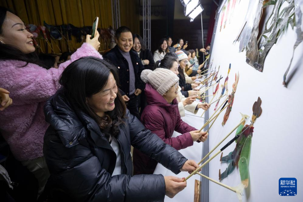 在位于阆中市的四川王皮影艺术博物馆,年轻观众受邀上台体验表演皮影戏《迪斯科》(2月19日摄)。