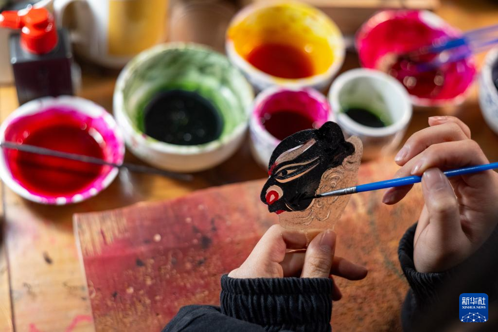 王彪的徒弟在给影人“张飞”的头部上色(2月19日摄)。