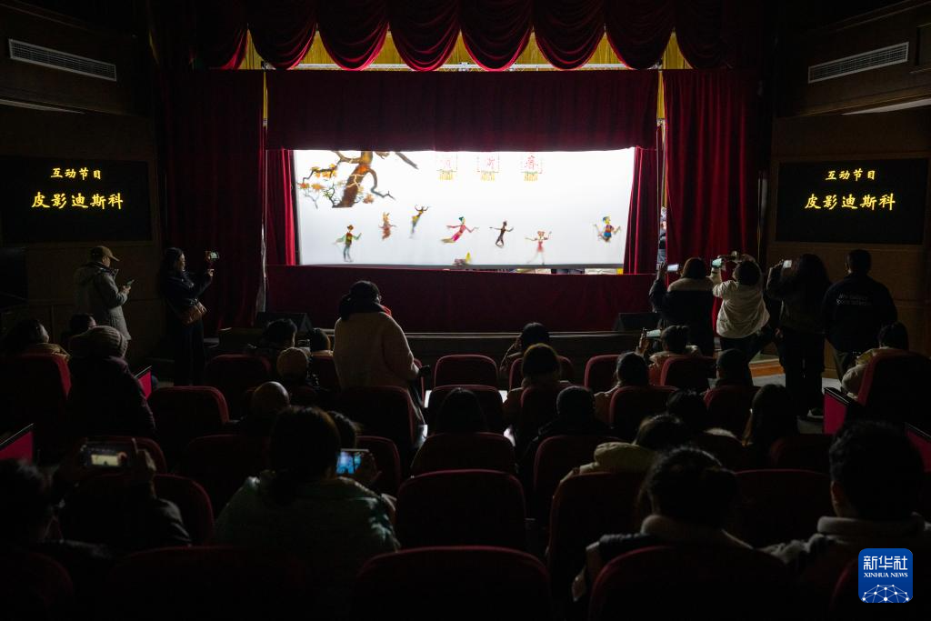 在位于阆中市的四川王皮影艺术博物馆,观众在观看皮影戏剧目《迪斯科》(2月18日摄)。