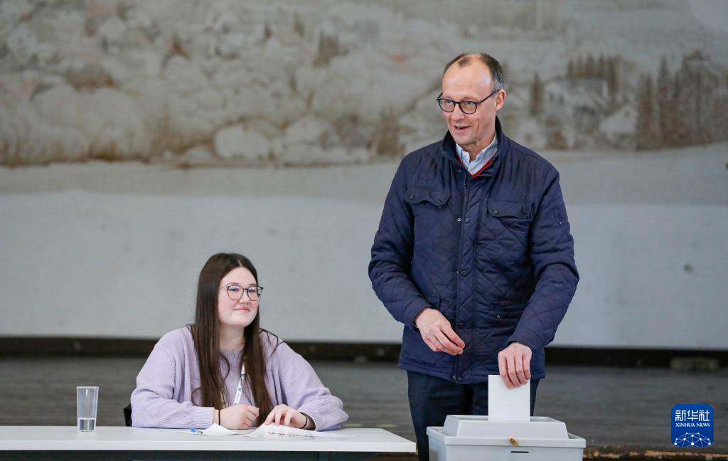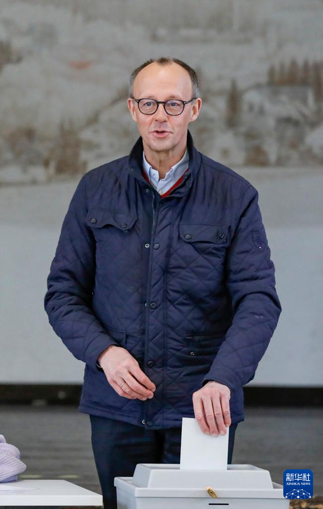 2月23日,在德国北莱茵-威斯特法伦州阿恩斯贝格,德国联盟党总理候选人默茨在一处投票站投票。
