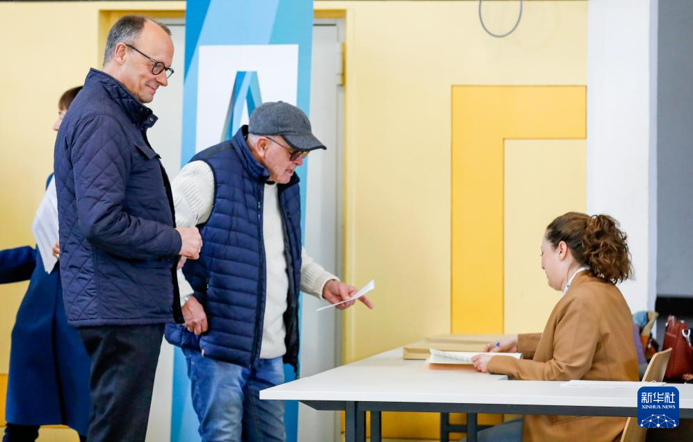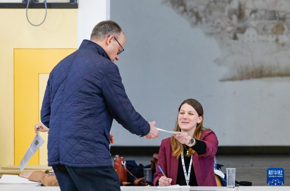 2月23日,在德国北莱茵-威斯特法伦州阿恩斯贝格,德国联盟党总理候选人默茨在一处投票站领取选票。