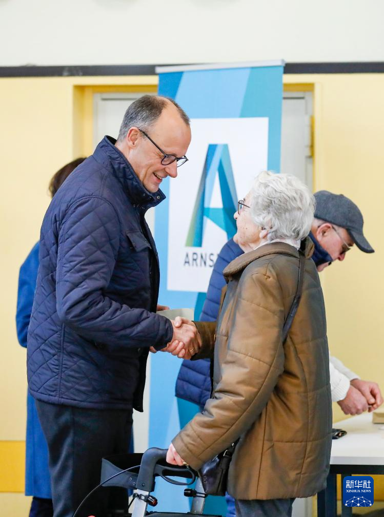 2月23日,在德国北莱茵-威斯特法伦州阿恩斯贝格,德国联盟党总理候选人默茨(左)在一处投票站与选民握手。