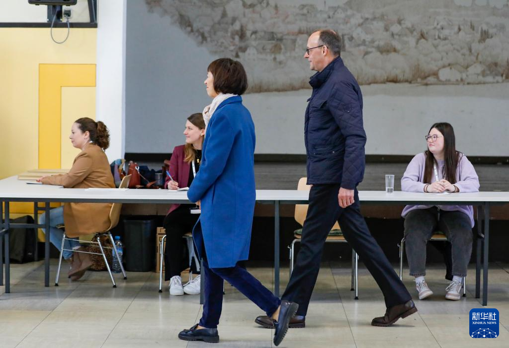 2月23日,在德国北莱茵-威斯特法伦州阿恩斯贝格,德国联盟党总理候选人默茨在一处投票站投票后离开。