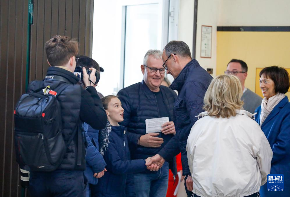2月23日,在德国北莱茵-威斯特法伦州阿恩斯贝格,德国联盟党总理候选人默茨在投票站与一名儿童握手交谈。