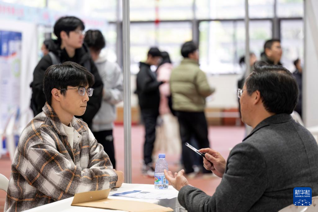 2月23日,在“海峡启航”百家央企招聘会现场,一名高校毕业生(左)在向用人单位工作人员了解企业情况。