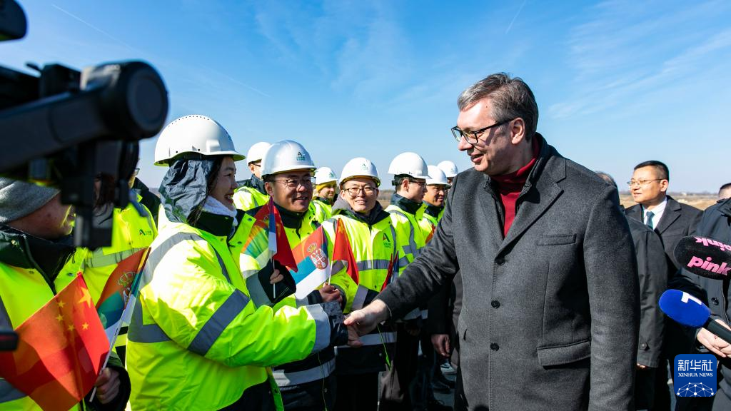 2月22日,在塞尔维亚波扎雷瓦茨,塞总统武契奇(前右)与中方建设者握手。