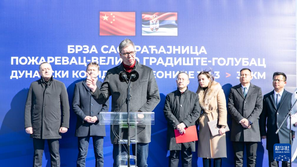 2月22日,塞尔维亚总统武契奇(前)在波扎雷瓦茨举办的“多瑙走廊”快速路项目主线部分路段通车仪式上致辞。
