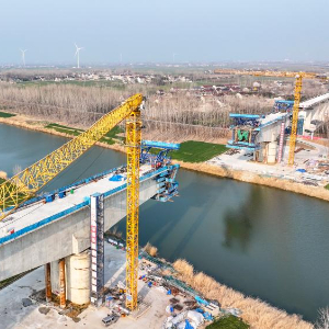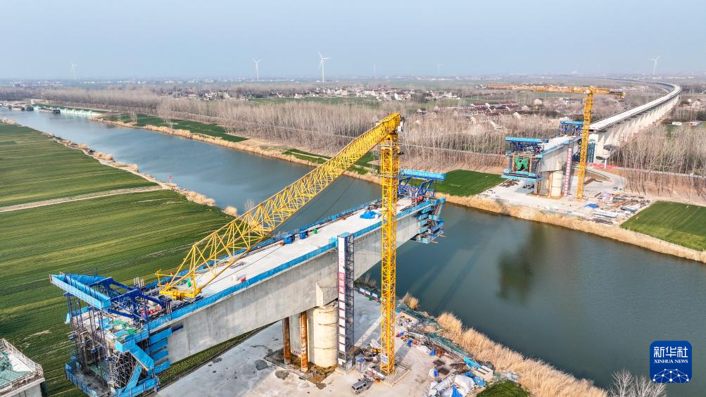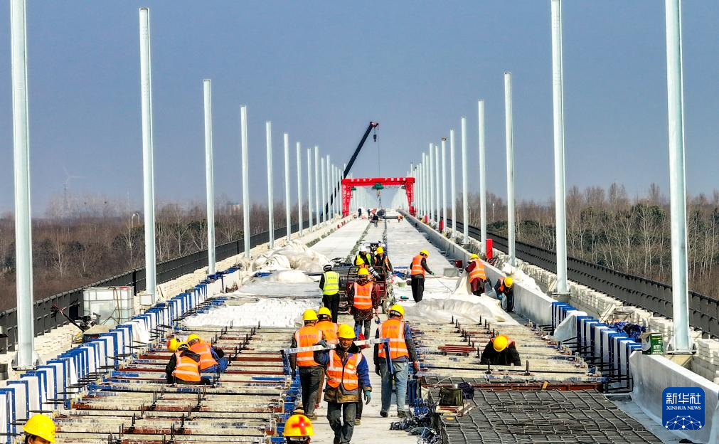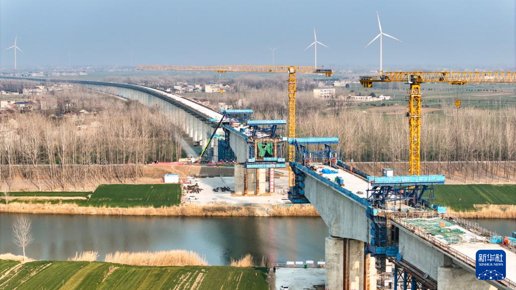 2月25日拍摄的中铁四局阜淮铁路跨涡河特大桥连续梁施工现场(无人机照片)。