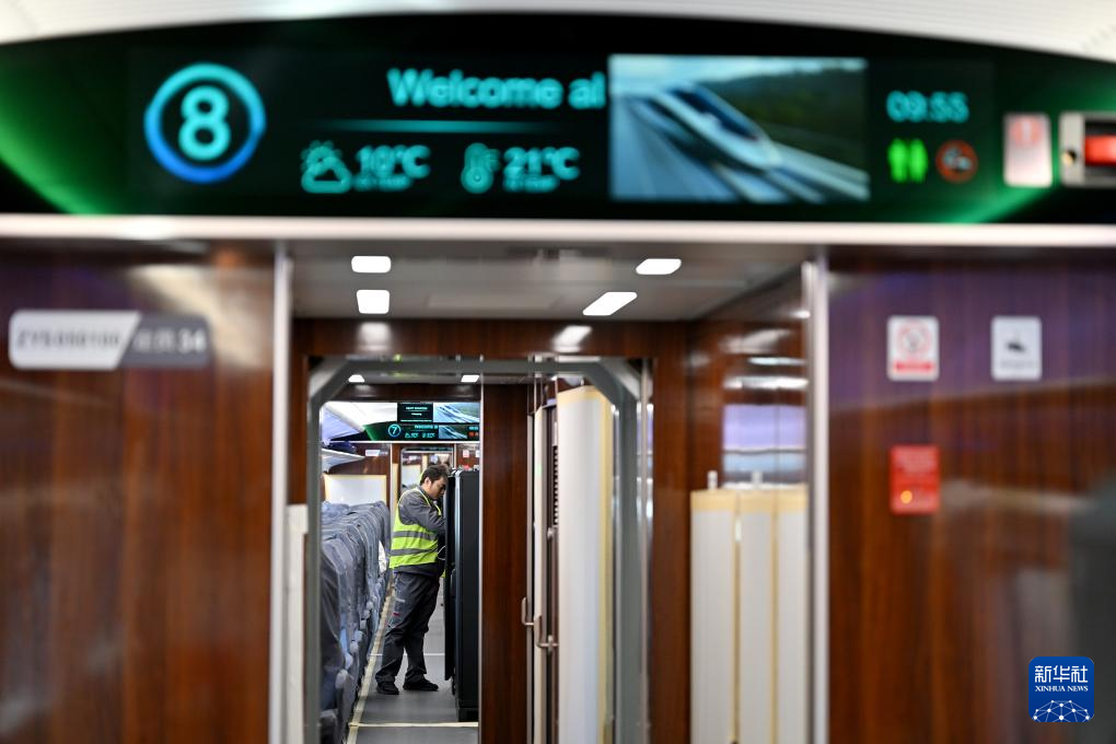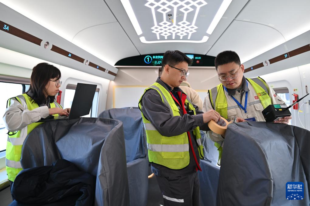 2月25日,工作人员在铁科院国家铁道试验中心对CR450动车组样车进行试验验证时在车厢内布置温度传感器。
