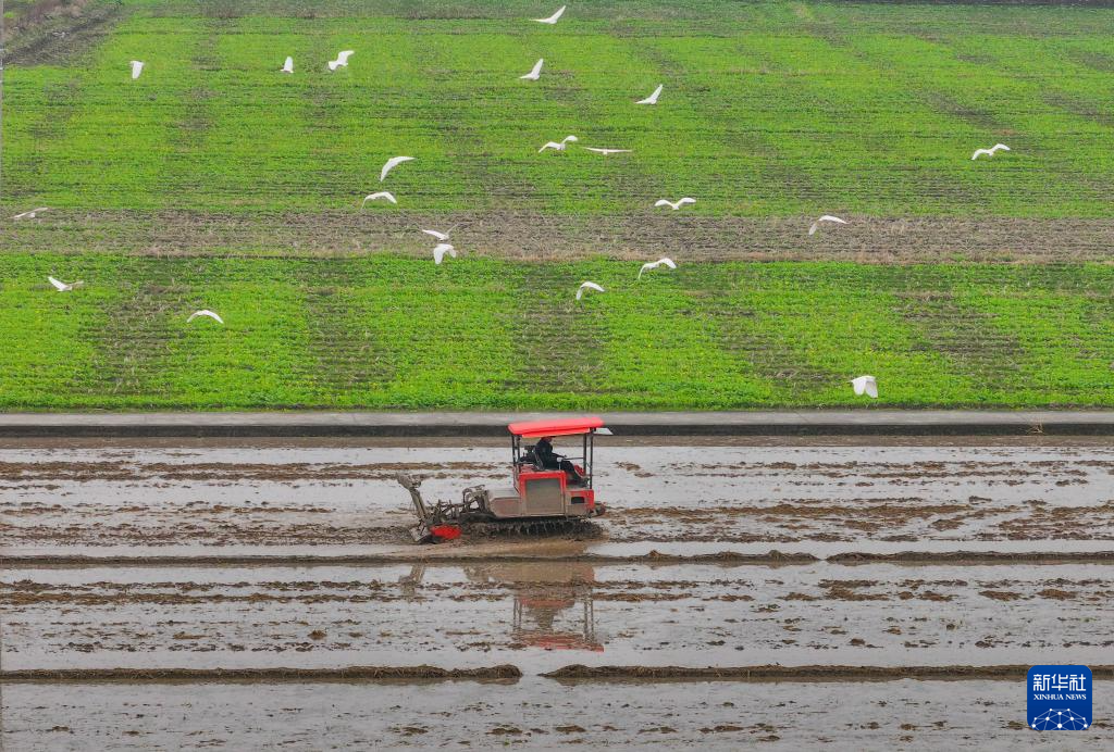 2月25日,在浙江省瑞安市马屿镇儒阳村,农机在田间犁地,白鹭低空而飞(无人机照片)。