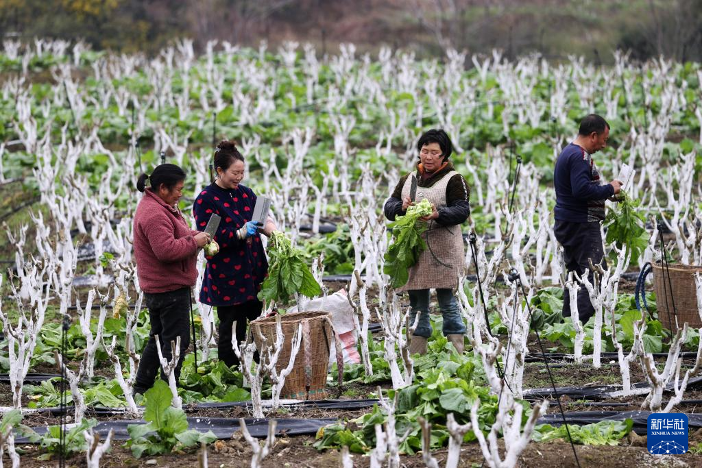 2月25日,村民在重庆市黔江区太极镇李子村蚕桑基地采收与桑树套种的青菜头。