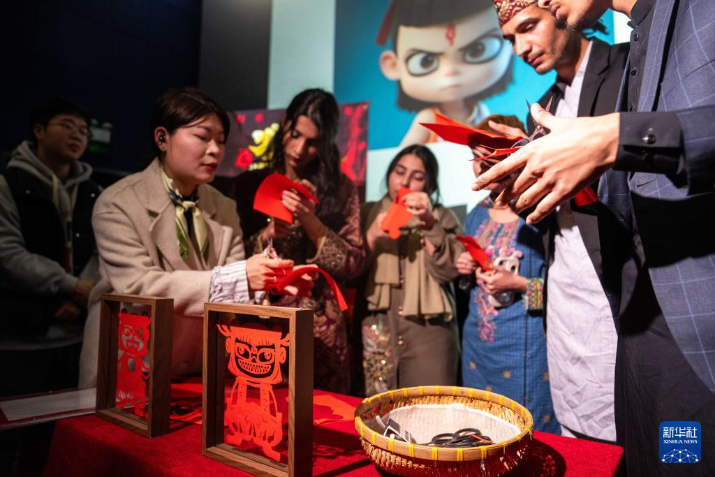 2月25日,在长沙摩天轮国际影城,留学生们在志愿者(左二)的指导下学习非遗剪纸技艺,制作“哪吒”文创产品。