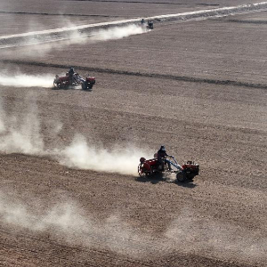 2月26日,在银川市贺兰县立岗镇通伏村,农户在田间播种小麦(无人机照片)。