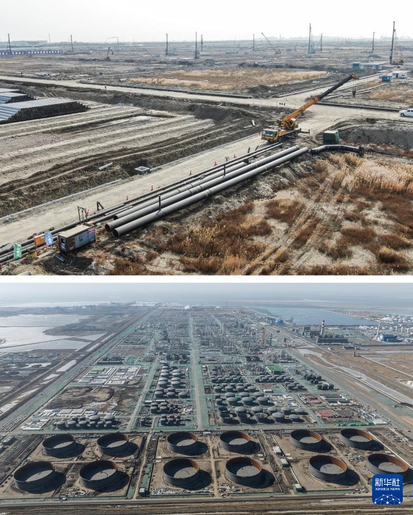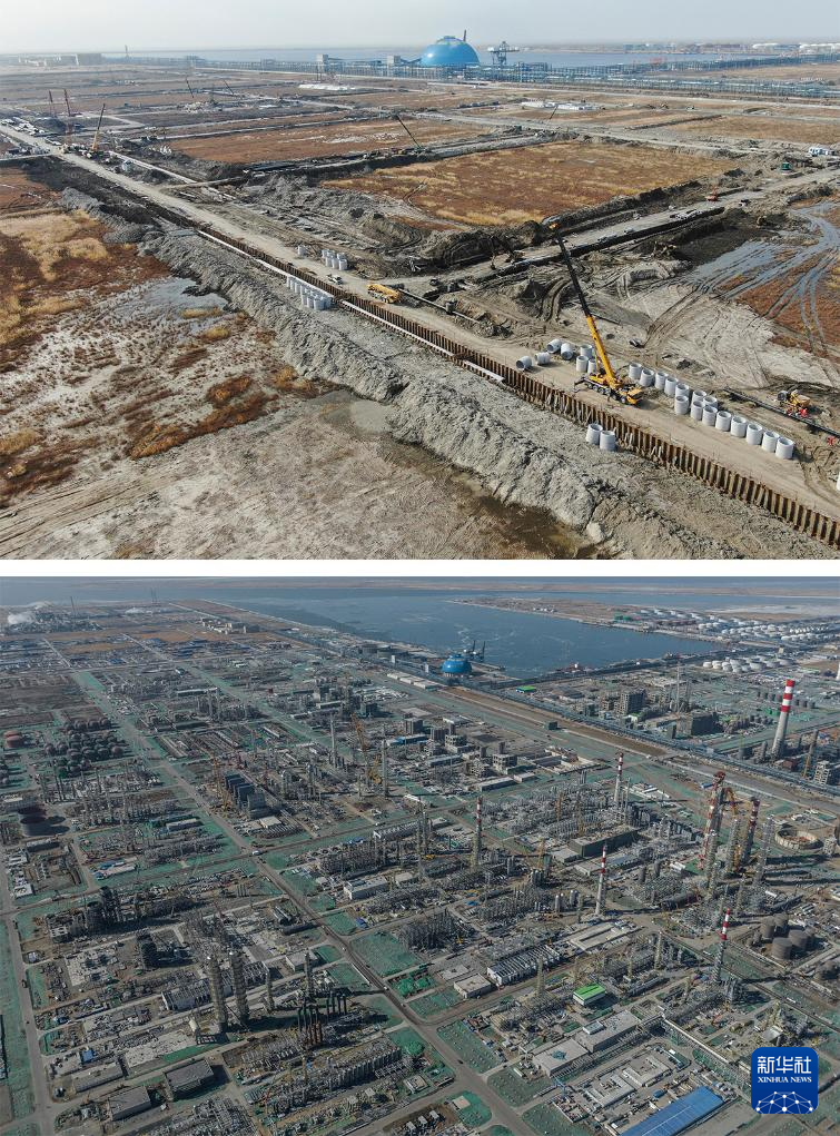 拼版照片:2023年11月1日(上图)和2025年2月26日(下图)拍摄的华锦阿美精细化工及原料工程项目施工现场(无人机照片)。