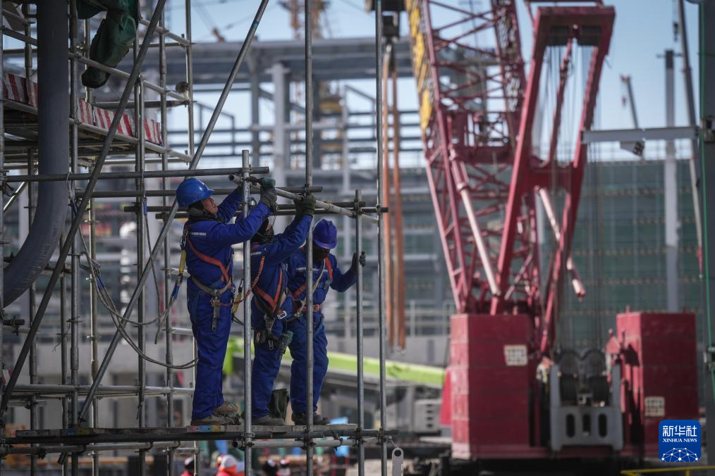 2月26日,工作人员在华锦阿美精细化工及原料工程项目现场施工。