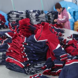 2月26日,在位于织里镇的浙江迈凯斯顿品牌管理有限公司的车间,工人分类打包成品校服。该企业是一家集校服与园服研发、生产、销售于一体的生产企业,年生产服装500万套以上。