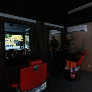 2月25日,在智利首都圣地亚哥,一名理发师在停电的理发店内整理工具。