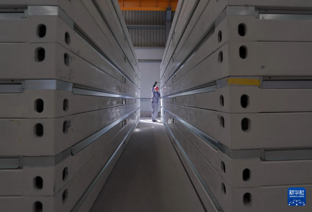 2月27日,河北省唐山市芦台经济开发区一家集成房屋制造企业的质检员在成品车间工作。