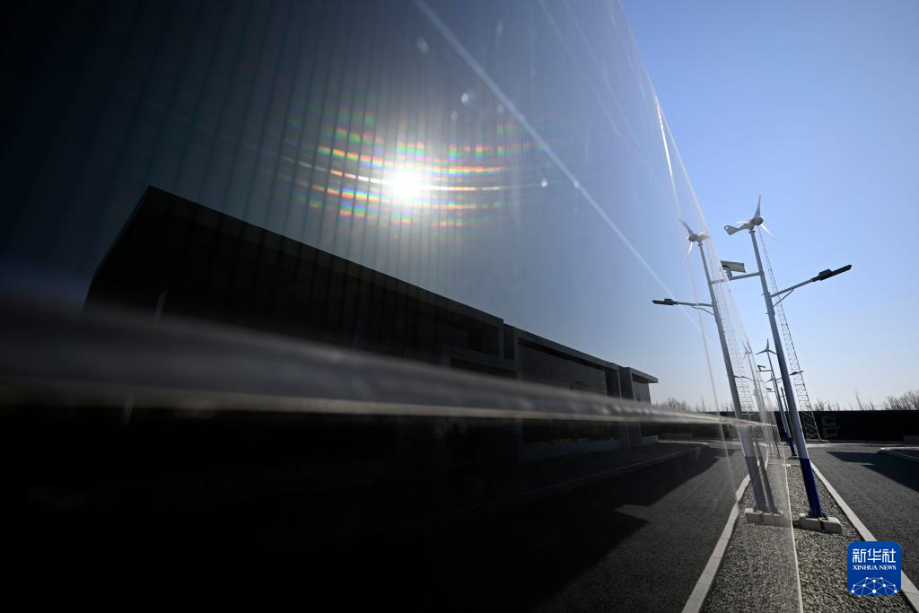 图为2月27日在宁夏银川原隆110千伏变电站内拍摄的碲化镉发电玻璃光伏组件围墙与小型风力发电机。