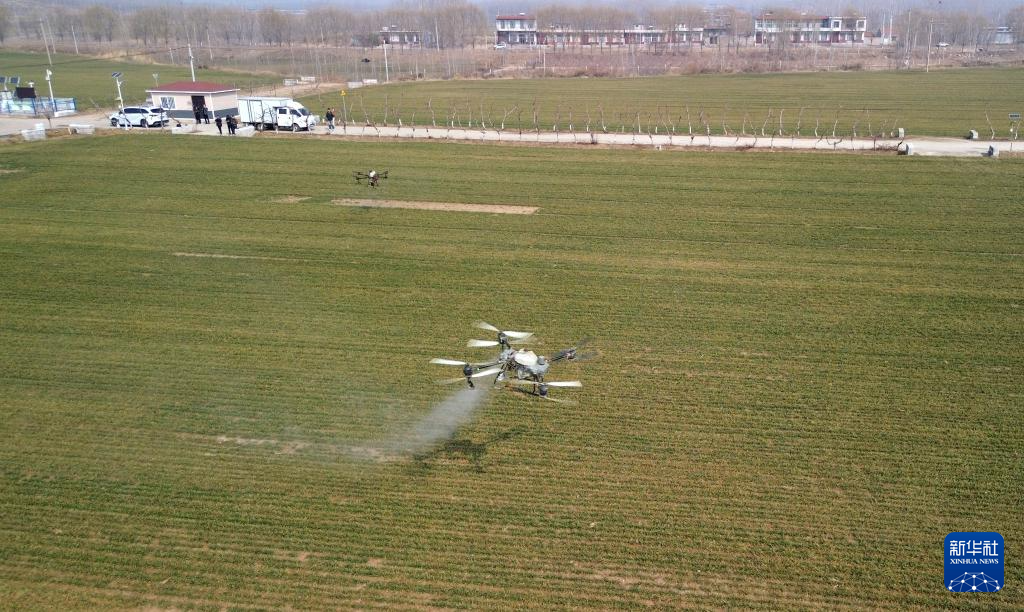近日,山东泰安新泰市天气转暖,小麦进入返青期,当地植保无人机飞手忙着在麦田开展无人机杂草防治、肥料喷施等作业。近年来,新泰市大力发展无人机植保服务,目前全市有持证植保无人机飞手100余名,可服务农田面积超过30万亩。