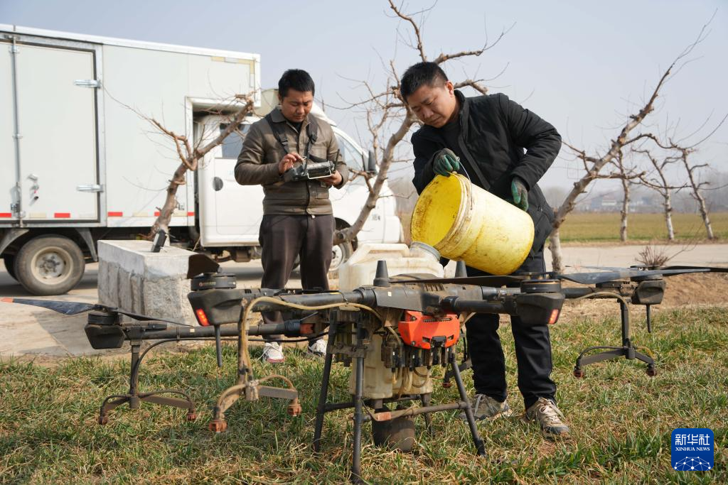 2月27日,植保无人机飞手在山东省新泰市禹村镇准备作业。