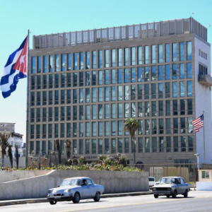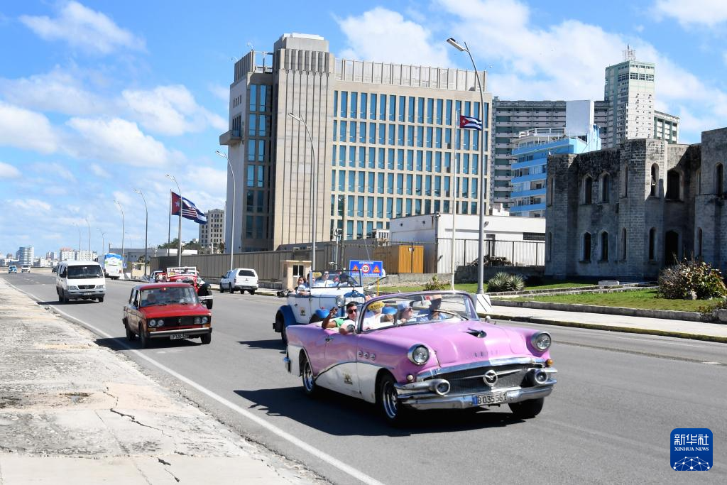 2月26日,在古巴首都哈瓦那,车辆驶过美国驻古巴大使馆。