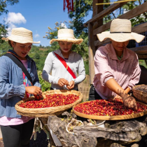 2024年10月30日,在云南省普洱市孟连傣族拉祜族佤族自治县桥安咖啡庄园,三名咖农在打理新采摘的咖啡鲜果。