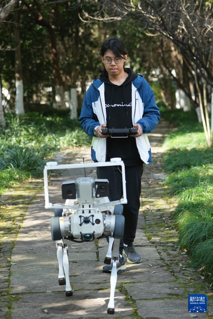 2月28日,杨俊在一条林荫道上实地测试一台即将交付用户的搭建双光云台和定位模块的四足机器人。