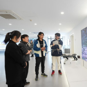 2月28日,杨俊(左二)和同事在公司为客户展示一款行业应用四足机器人。