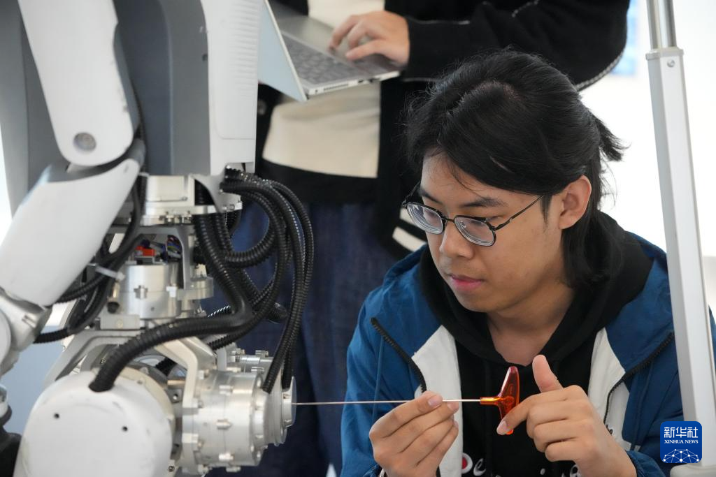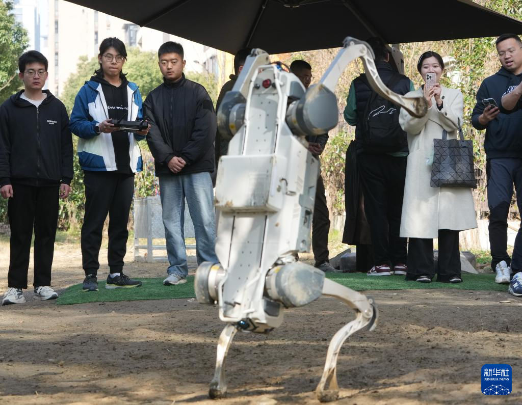 2月28日,杨俊(左)向同事学习一款全地形越野机器人的操控。