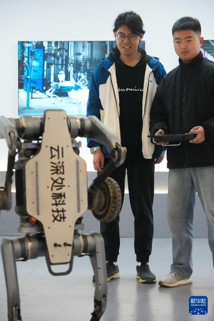 2月28日,杨俊(右)在公司为客户介绍一款四足机器人。