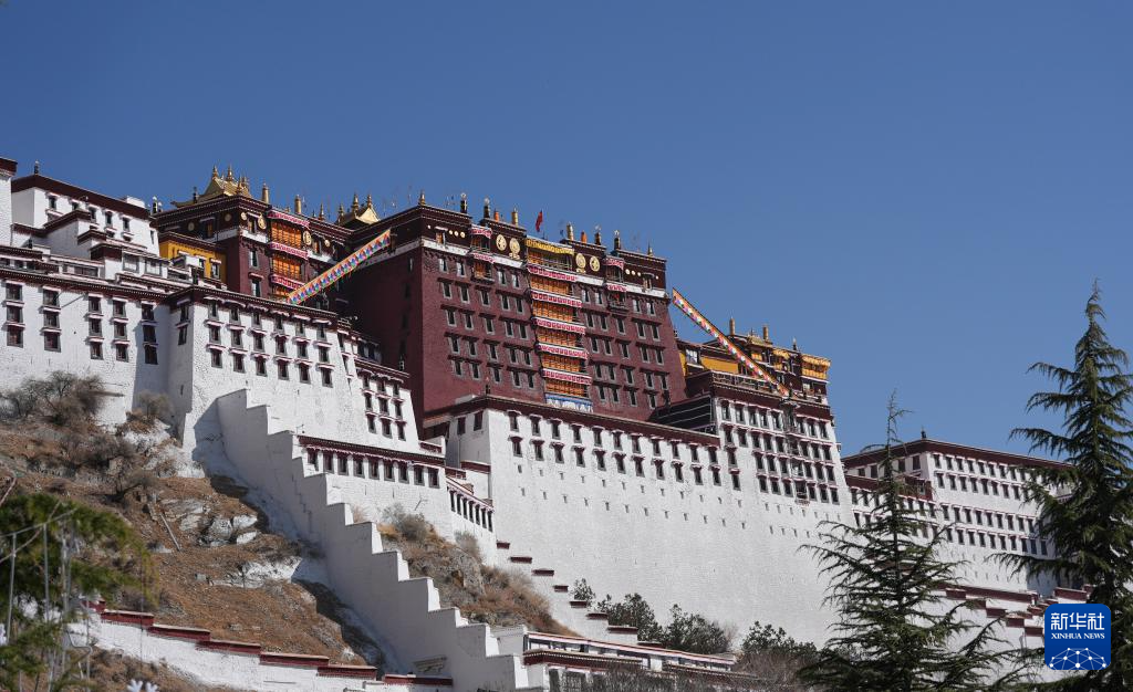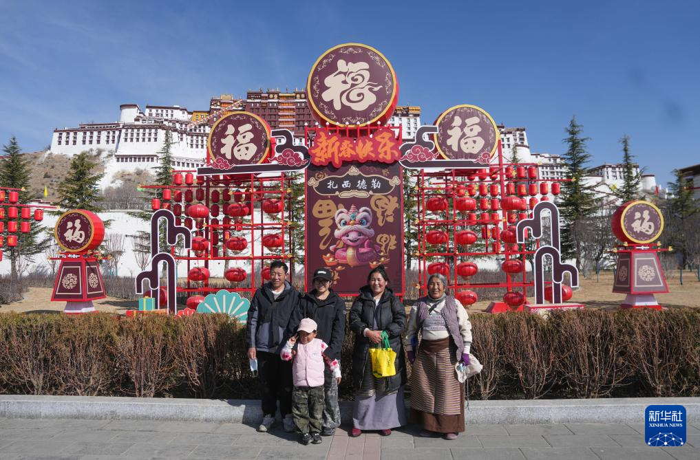 2月28日,游客在拉萨布达拉宫前合影留念。