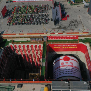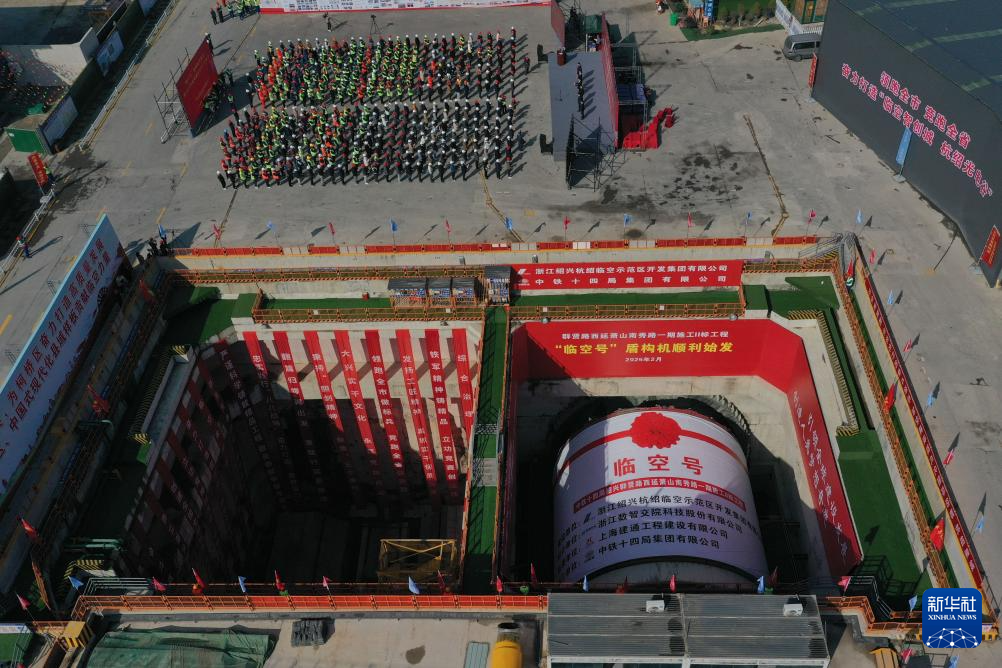 2月28日在浙江绍兴群贤路西延萧山南秀路一期Ⅱ标工程隧道工作井拍摄的“临空号”盾构机(无人机照片)。